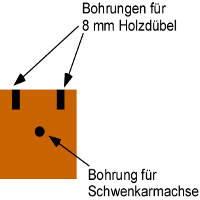 ![]() 3. Nun werden die 4 Lagerplatten auf die Maße 12x10x2,5 cm zugesägt. Dann werden die 8 mm Bohrungen für die Riffeldübel mit Hilfe eines Dübelgerätes gebohrt. Beim Bohren ist darauf zu achten, dass die Bohrungen den gleichen Abstand wie die Bohrungen in der Tragplatte haben, damit sich die Lagerplatten problemlos montieren lassen. Anschließend bohrt man die die 8 mm Bohrungen für die Schwenkarmachse senkrecht in alle 4 Lagerplatten. Die Bohrungen müssen exakt in der Flucht liegen, damit sich die Garderoben Schwenkarme befestigen lassen. |